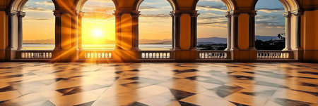 Grand Hall Sunset Panorama Majestic Arches Framing Golden Sunlight Cascade Over Cityscape Splendor