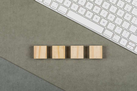 Business concept with keyboard, wooden cubes on greenish brown and grey background flat lay.
