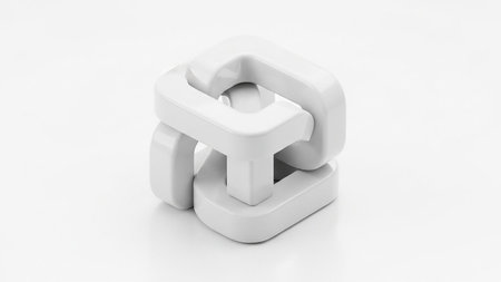 Abstract interlocking white geometric shapes forming a complex cube-like structure on a white background.