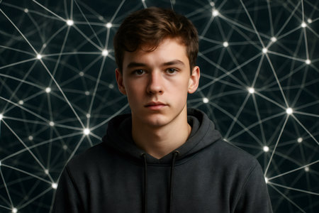 Serious young man surrounded by neural network connections, symbolizing digital entrapment and the complexities of online identity