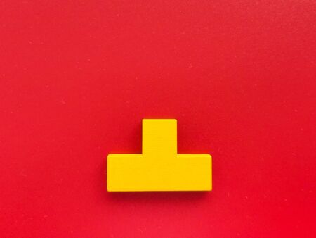 Different colorful shapes wooden puzzle blocks on yellow background. Geometric shapes in different colors, top view