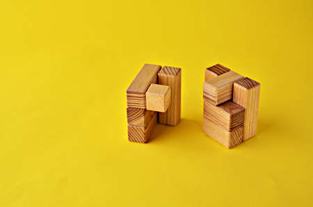 Two halves of a wooden cube logical game on a yellow background with a copy space. Solving logical problems.