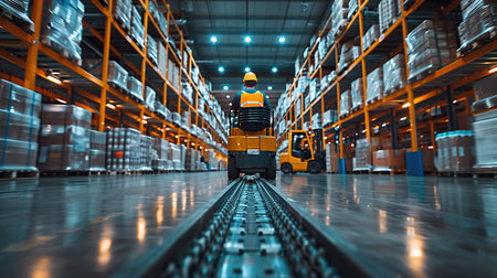 Commercial warehouse spacious distribution center with tall shelves in industrial logistics setting