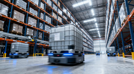 Autonomous mobile robots navigate a warehouse, optimizing logistics and streamlining the supply chain process
