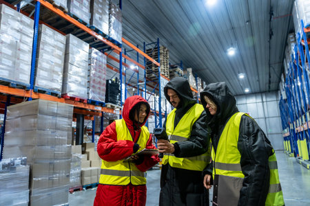 Diverse team in cold storage gear and high visibility vests using barcode scanner and tablet to coordinate inventory and shipments in a large frozen warehouse facility