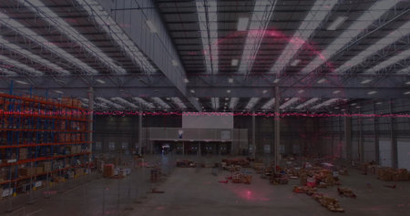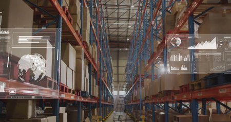 Digital data analytics overlay showing graphs and global connections in warehouse. technology, logistics, networking, industry, innovation
