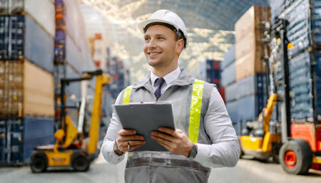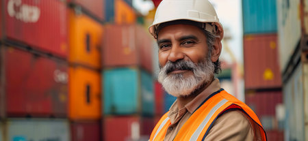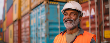 A smiling male logistics coordinator managing harbor operations, surrounded by shipping containers, ensuring efficient and timely delivery of cargo.