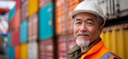 Chinese worker standing in front of stacked shipping containers. Container terminal - freight shipping background. Import export concept. International trade banner