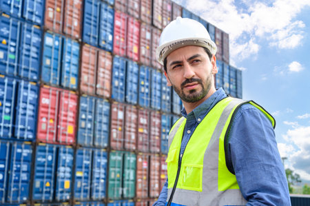 team engineer he is working in container box yard area of logistics transportation import export or shipping industry