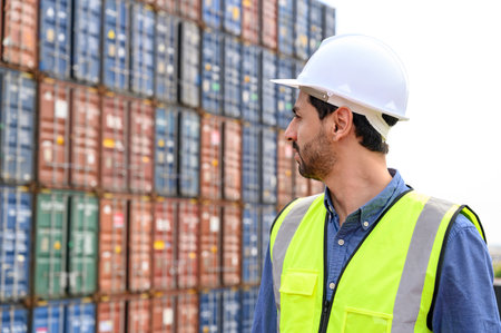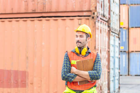 Engineer man in hard hat and safety vest stainding at containers cargo, Factory worker checking containers box