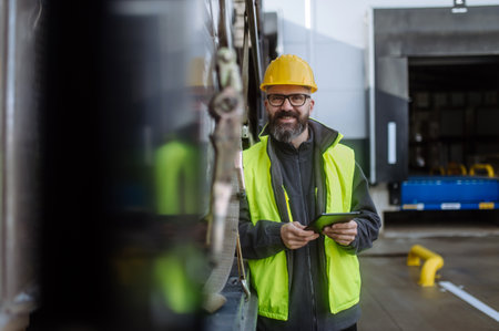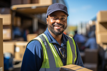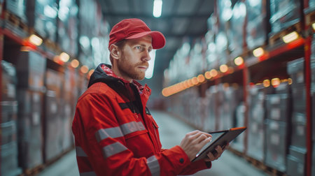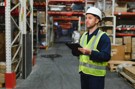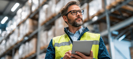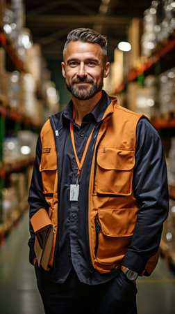 Experience the efficiency of warehouse operations with a middle-aged worker in logistics. Dressed in a uniform, he plays a crucial role in handling goods, managing inventory, and facilitating smooth logistics processes.