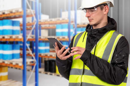 Man in a fuel warehouse. Storekeeper with an electronic tablet in his hands. Blurred shelves with barrels as a background. Storage of liquids in a warehouse. Storage of fuel and chemicals.
