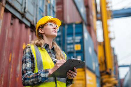 A woman in a safety vest and hard hat stands in a bustling shipping yard. She is checking inventory and taking notes on a clipboard. The background shows shipping containers stacked high.