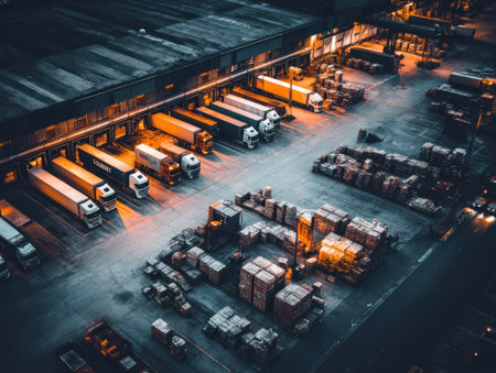 High-angle night shot of a busy distribution center; trucks docked, illuminated, with packages