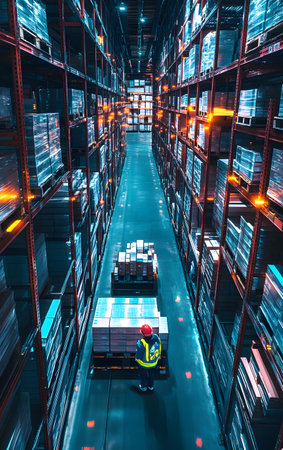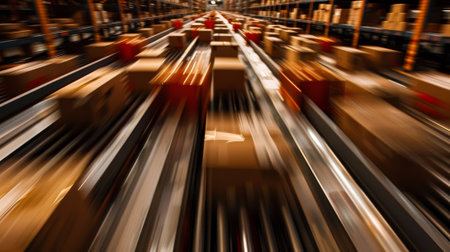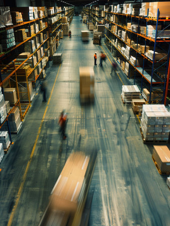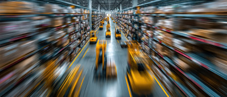 Supply chain warehouse with inventory management and tracking in motion showing fast logistics and organized storage system.