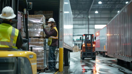 Warehouse Workers Loading Cargo Trucks for Shipping in Industrial Distribution Center