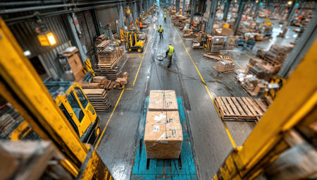 This image depicts an active warehouse environment filled with stacked boxes and machinery. The composition features a perspective view down an aisle, with workers managing the flow of goods. The scene has a strong industrial feel, with a focus on efficiency and organized storage. This image could be used for illustrating topics related to distribution and supply chain.
