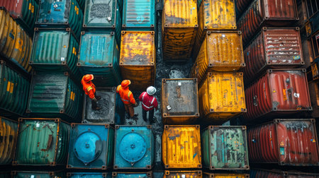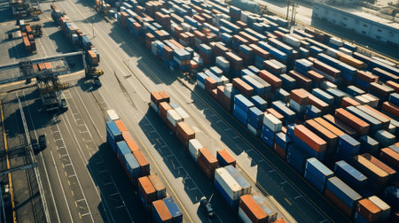Stunning aerial view of vibrant shipping containers stacked at a busy port, with cranes actively working, symbolizing global trade, logistics, and maritime transportation efficiency.