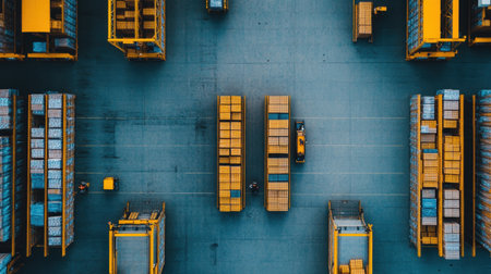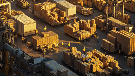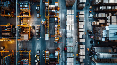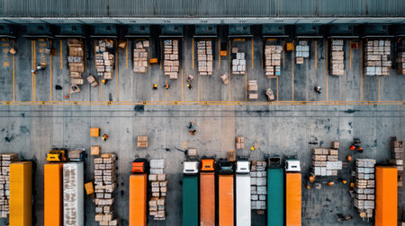 This aerial image captures the bustling activity at a distribution center, showcasing colorful trucks and neatly organized stacks of boxes in a modern logistics environment.