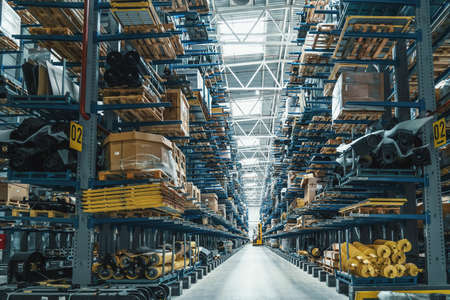 Modern distribution retail warehouse interior with many high shelves, boxes and goods on racks ready for delivery and shipping.