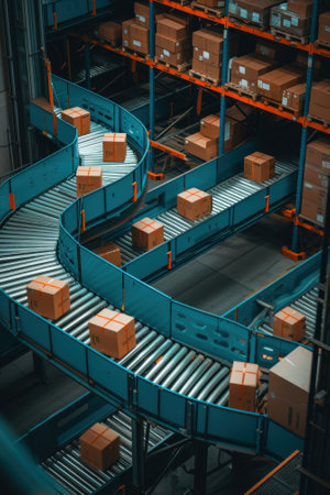 This image showcases an expansive warehouse interior featuring a conveyor belt system amid stacks of boxes, illustrating modern logistics and efficient operations.