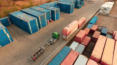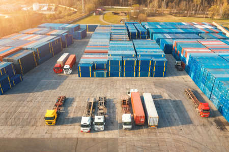 Aerial view of trucks and containers at sunset. Top view of autotrucks, container warehouse in logistics terminal for export and import. Business. Freight transportation. Shipping and cargo. Industry