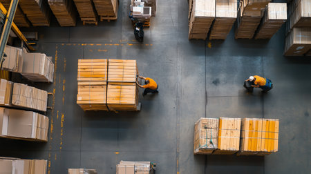 Workers manage inventory in a large warehouse, organizing wooden pallets on a busy floor during daylight hours
