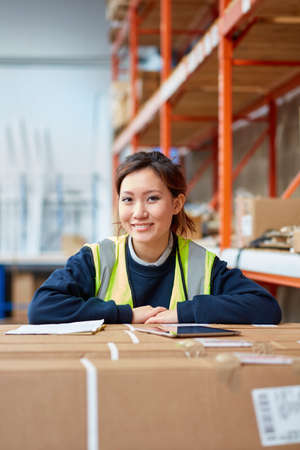 Portrait of female factory worker in factory warehouse