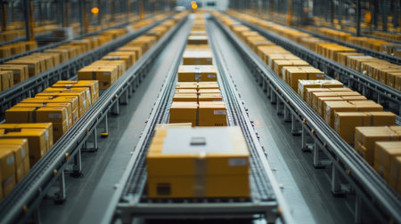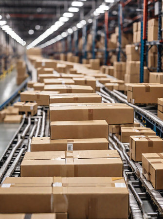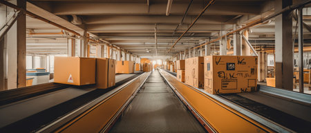 Conveyor belt with cardboard boxes in warehouse. Industrial background.