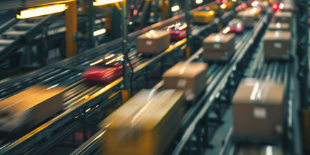 A blurry image of a conveyor belt with many boxes and cars on it. Scene is busy and fast-paced, with the conveyor belt moving quickly and the cars and boxes appearing to be in motion