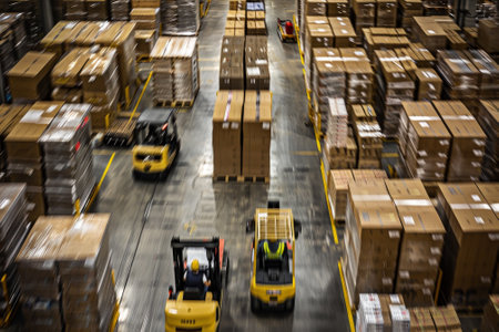 Large logistics warehouse with clear rows of product storage and active machinery, emphasizing the scale and organization required for effective supply chain management.