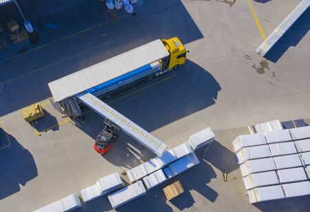 Aerial view of loading trucks in the logistics center of a large transport company