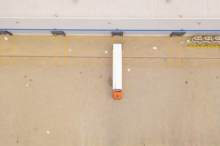 Semi Trucks in Warehouse during transportation on leading commodity. Photo of logistic from Aerial View.