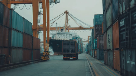 A cargo truck navigates through a container port, surrounded by stacked containers and a cargo ship in the background, showcasing industrial transport activity.