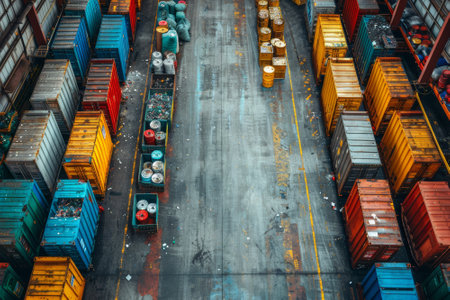 A stunning aerial shot of a busy cargo terminal showcasing organized shipping containers, a forklift in action, and efficient logistics operations.