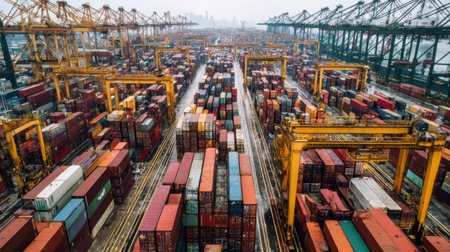 An aerial view of a busy container port showcasing rows of colorful cargo containers and tall cranes at work. The image highlights industrial logistics and maritime trade.