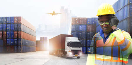 Double exposure of afican american man in industry and safety concept container truck ,ship in port and freight cargo plane in transport and import-export commercial logistic ,shipping business industry