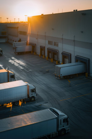 Early Morning Warehouse Operations with Delivery Trucks at Sunrise for Efficient Logistic Management