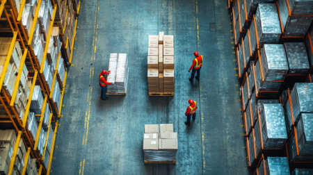 Warehouse workers in red vests organizing and transporting cardboard boxes on pallets