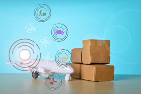 Stack of cardboard boxes and airplane with fast delivery of goods and products . Commodity trading, logistics, air cargo, parcels, airmail, shipping, fast delivery concept.