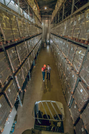 Warehouse workers checking stock in a large warehouse. This is a freight transportation and distribution warehouse. Industrial and industrial workers concept