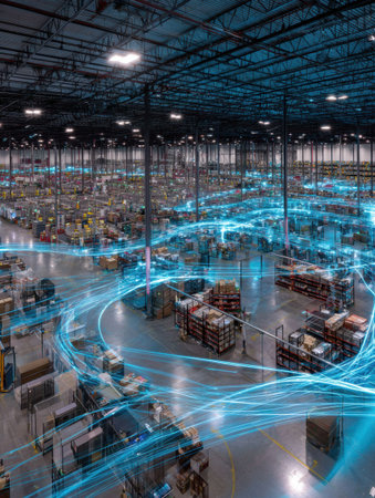 A modern warehouse interior with illuminated aisles, showcasing organized storage and advanced logistics for efficient operations.