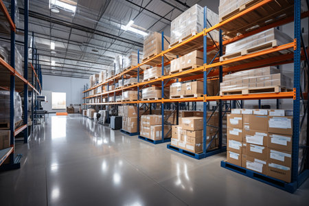 A wide warehouse aisle showcases organized pallet racks filled with boxes and packages. The modern industrial space is well-lit, emphasizing efficiency and organization.