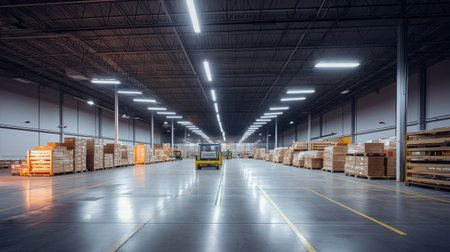 A yellow forklift drives down the center aisle of a large warehouse. The warehouse is filled with boxes, shelves, and other industrial equipment. The image is a typical representation of a modern logistics operation.