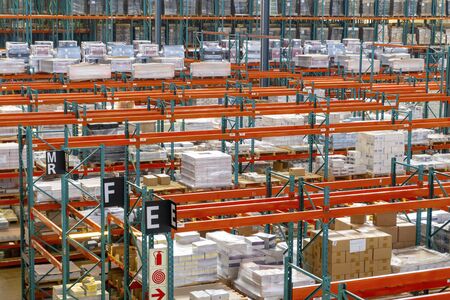 Modern distribution retail warehouse interior with many high shelves, boxes and goods on racks ready for delivery and shipping.