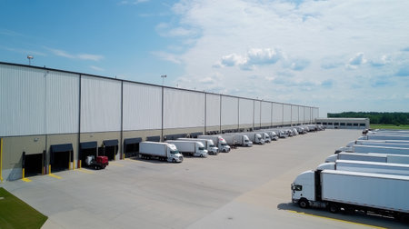 A drone captures a wide view of a clean and organized warehouse distribution center. Trucks are lined up, ready for loading, showcasing efficient logistics operations under a clear sky.