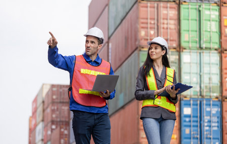 Engineer and Foreman Team Working at Industry Containers Cargo, Logistics Professional Inspecting Containers Box at Shipping Yard