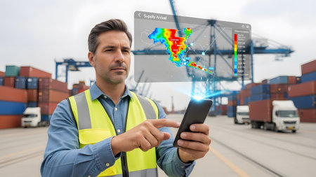 Logistics manager using augmented reality on a smartphone to monitor global supply chain operations