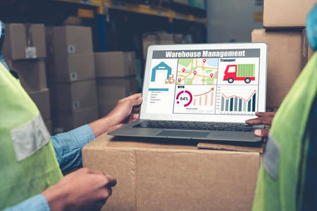 Warehouse management innovative software in computer for real time monitoring of goods package delivery . Computer screen showing smart inventory dashboard for storage and supply chain distribution .