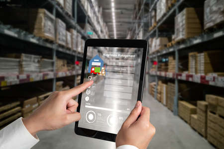 Smart warehouse management system with innovative internet of things technology to identify package picking and delivery . Future concept of supply chain and logistic network business .
